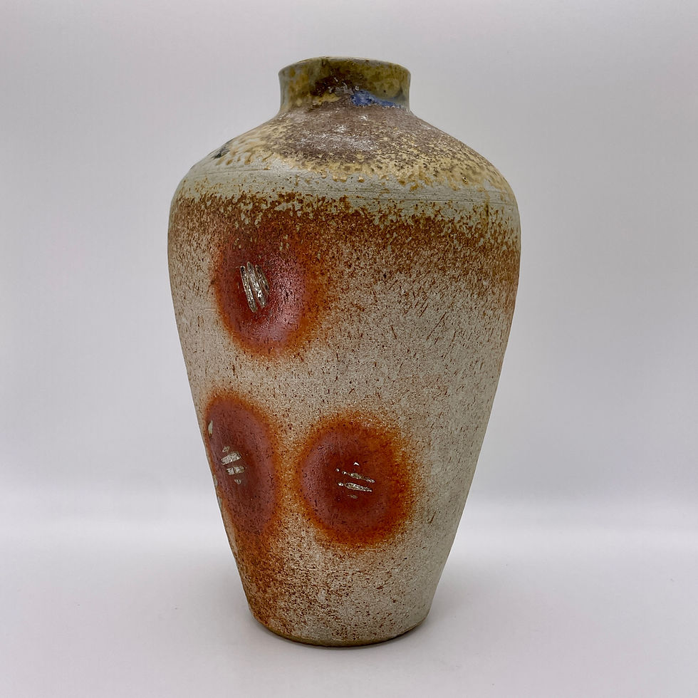 Stoneware jar with flashing slips, wood ash, Oribe and rutile blue glazes